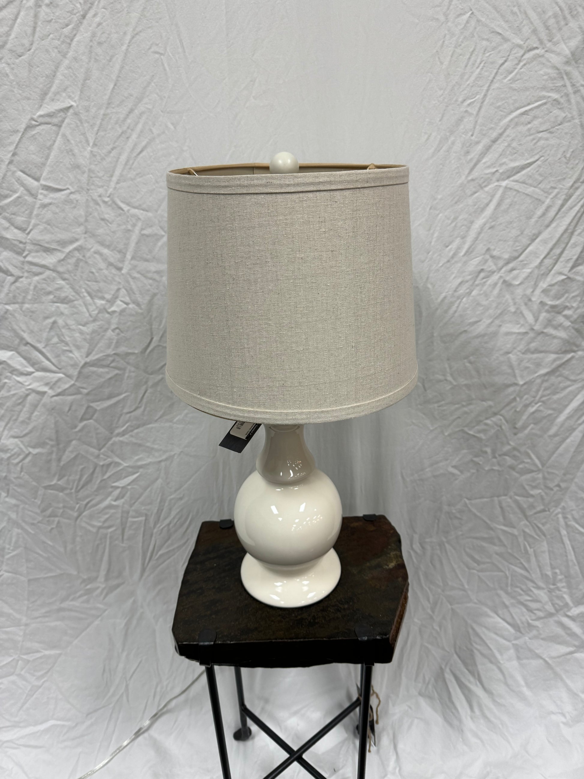 Simple curvy of white with beige lamp shade. Perfect for any space in your home. 22" tall, lamp shade is 12" wide.
