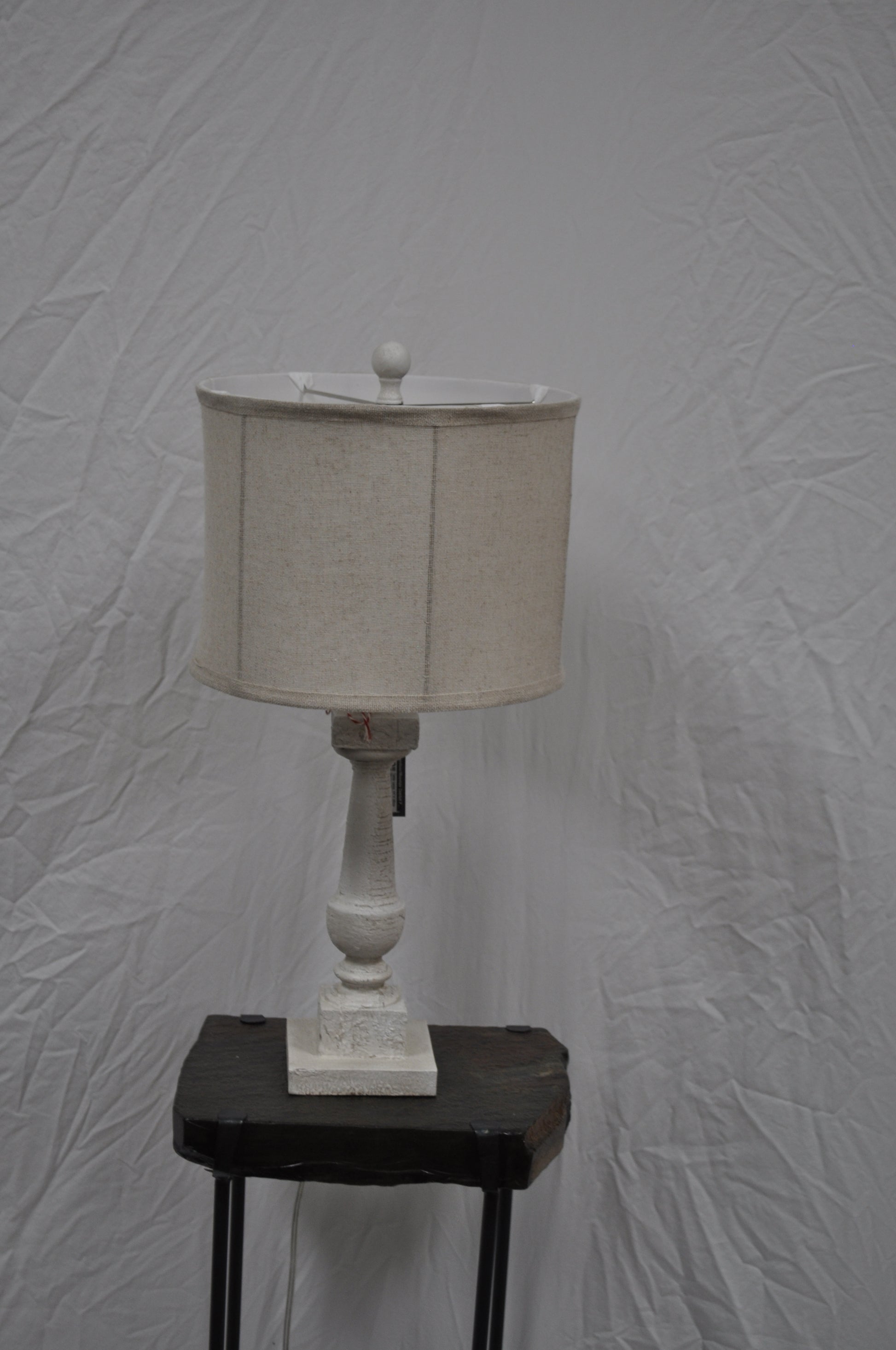 modern white wooden abstract table lamp with distressing. With a cream linen shade. With its simplistic looks it would make a nice addition to any home. The lamp is 24 inches tall and 12 inches wide.